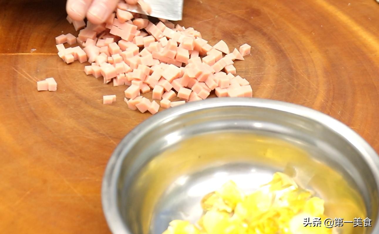 准备两个变蛋切成小块,半根火腿肠切成碎丁。