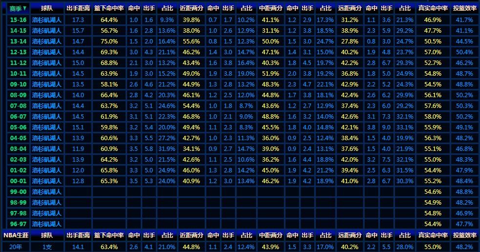 通过简单对比发现,大致是由于职业生涯中后期的出手数明显增加,导致24号的科比在得分方面有了更大的提升,其他数据几乎没有多大的变动。
