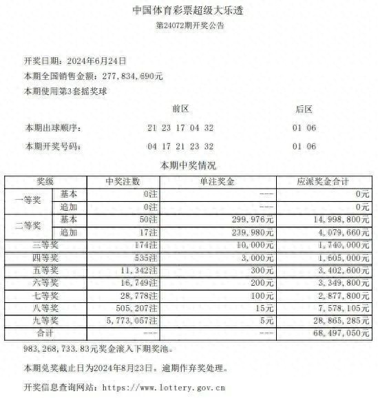 据中国体彩报消息,6月24日,超级大乐透第24072期开奖。前区开出号码“04、17、21、23、32 ”;后区开出号码“01、06”。本期全国销售2.77亿元,为国家筹集彩票公益金0.99亿元。