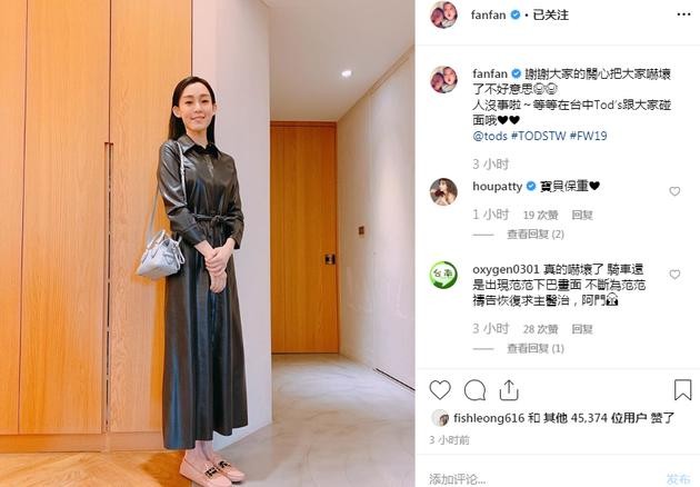 【范玮琪回应摔伤】9月5日凌晨,范玮琪在家中摔倒后,老公陈建州带其前往医院,伤口位置缝合了15针。做完手术不到半天时间,范玮琪在个人社交网站晒出了一张自己身穿黑色长裙的照片,并配文:“谢谢大家的关心把大家吓坏了不好意思,人没事啦~等等在活动中跟大家碰面哦。”范玮琪伤口位置得到良好处理,长发披肩笑对镜头状态佳。