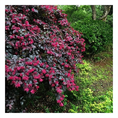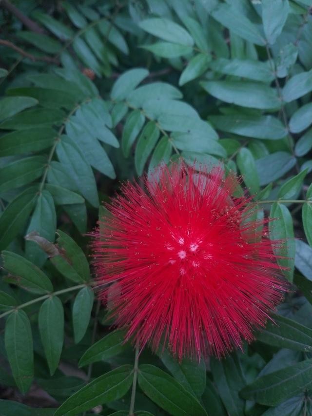 叶片暗红色,经常被剪成一个球,花开时节,满球红花。