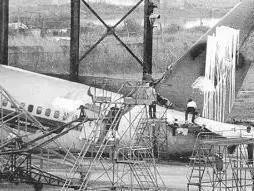 从距跑道南端388米至801米的范围内,道面上有较多的铆钉(多数为剪切痕迹),还有少量金属片、胶管、固定夹等散落物。上述情况表明,第一次着陆时,飞机结构受损。