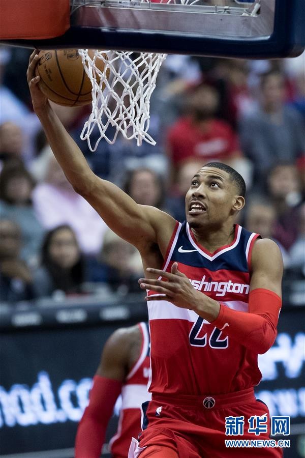 ↑11月17日,奇才队球员奥托·波特在比赛中上篮。当日,在2017-2018赛季NBA常规赛中,迈阿密热火队客场以91比88战胜华盛顿奇才队。 新华社发(沈霆摄)