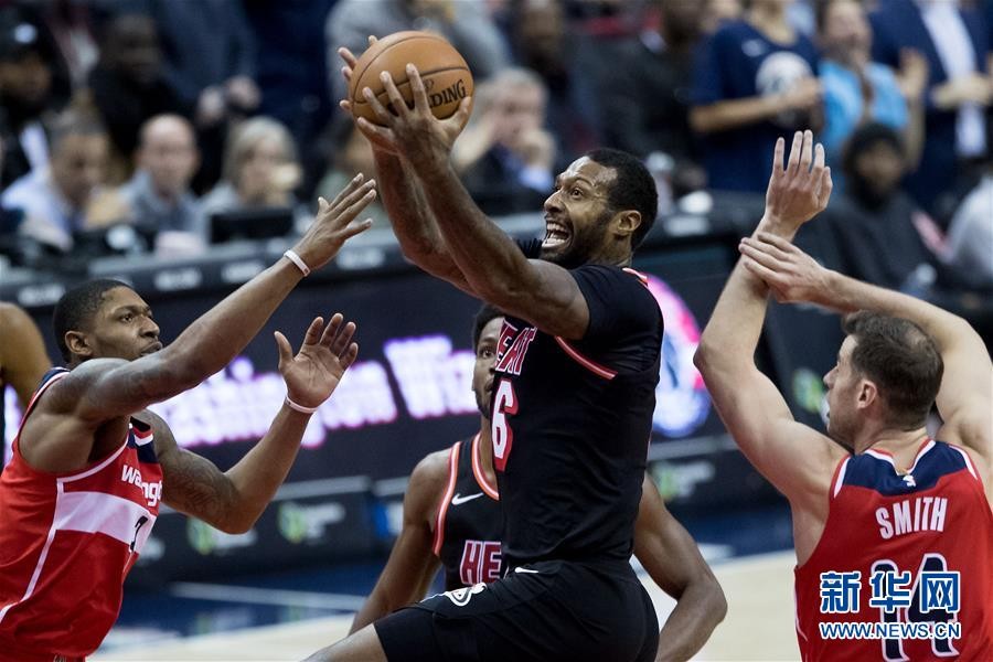 ↑11月17日,热火队球员约翰逊(中)在比赛中突破上篮。当日,在2017-2018赛季NBA常规赛中,迈阿密热火队客场以91比88战胜华盛顿奇才队。 新华社发(沈霆摄)