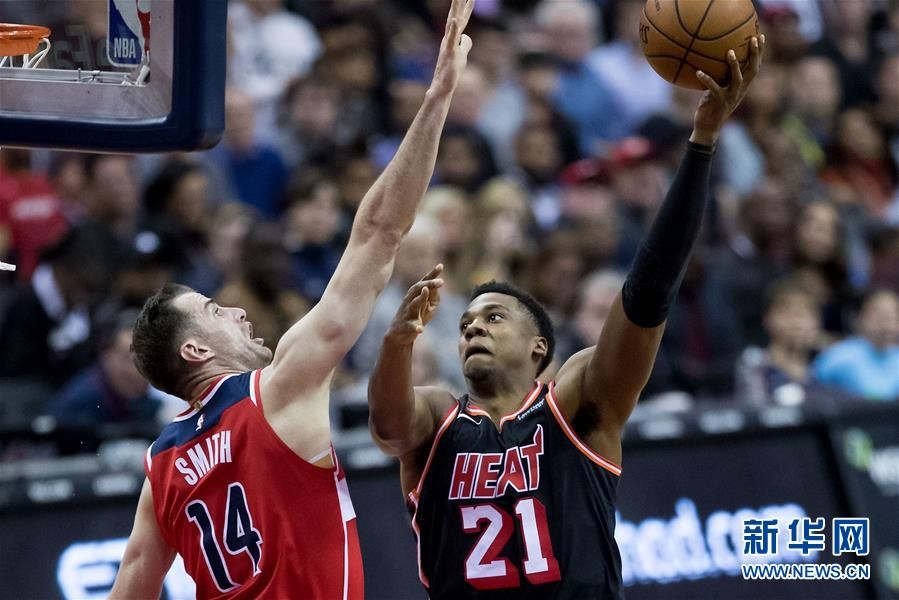 ↑11月17日,热火队球员怀特塞德(右)面对奇才队球员史密斯的防守投篮。当日,在2017-2018赛季NBA常规赛中,迈阿密热火队客场以91比88战胜华盛顿奇才队。 新华社发(沈霆摄)