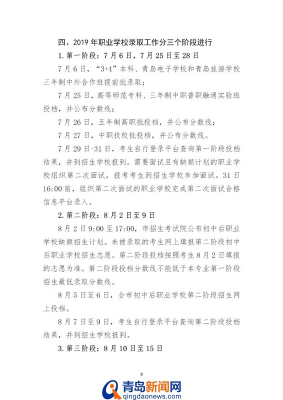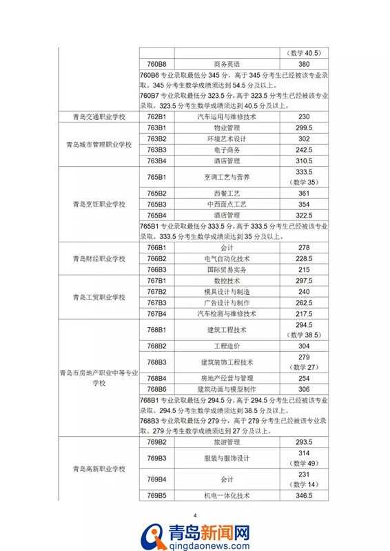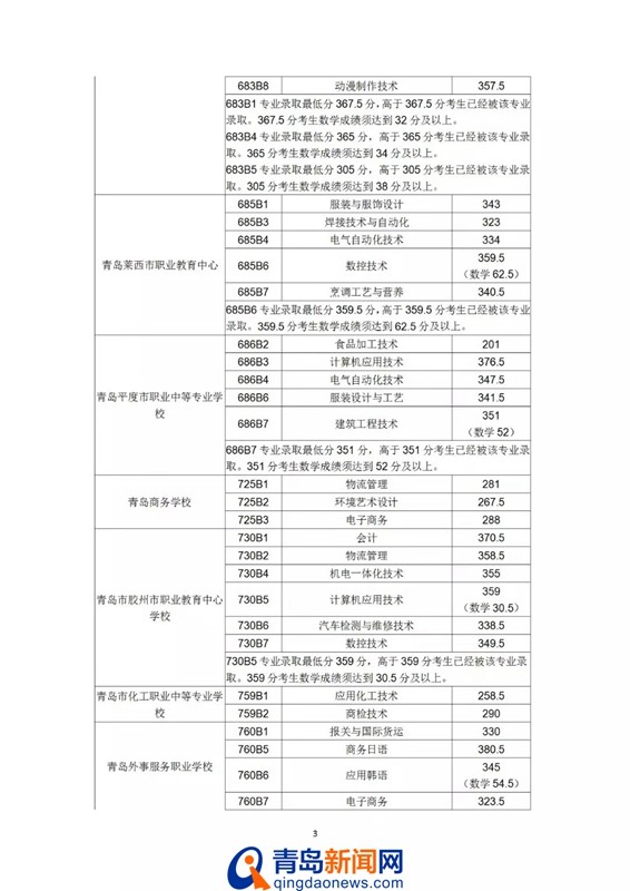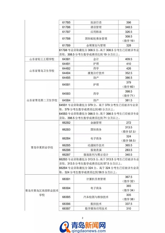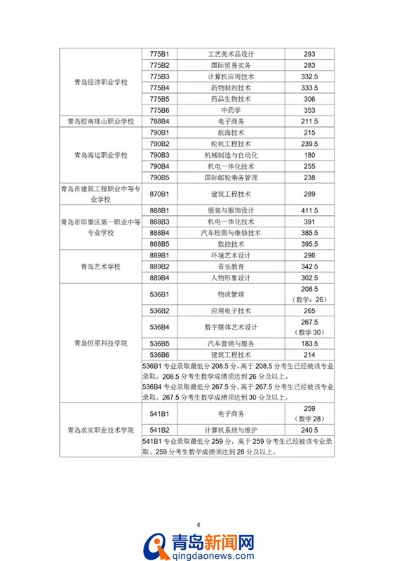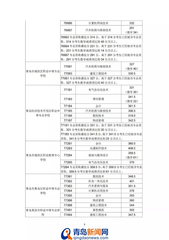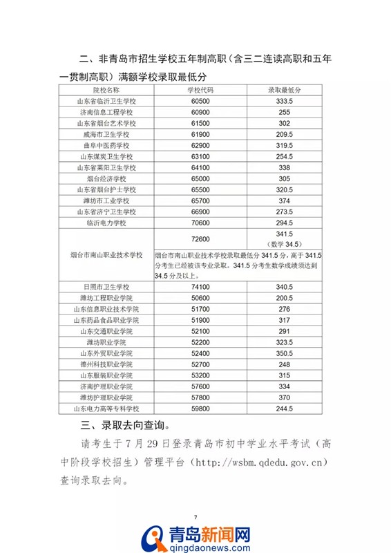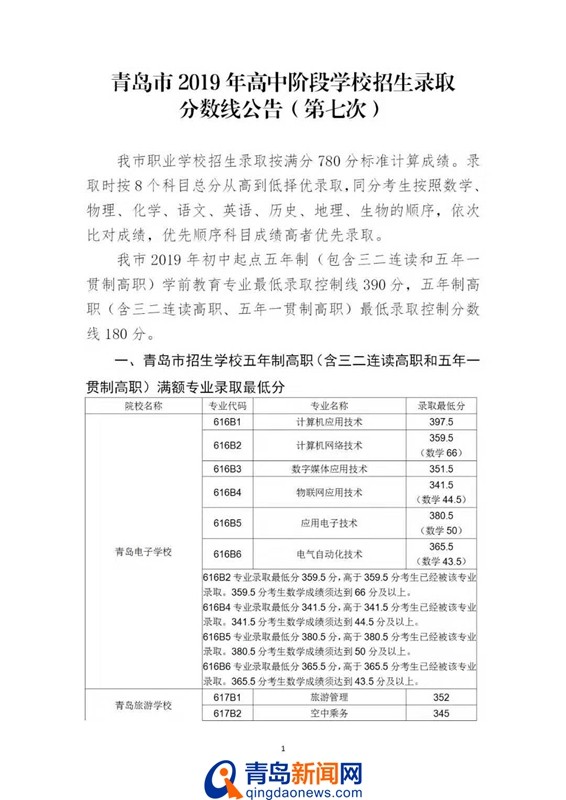 青岛新闻网7月26日讯(记者 于泓)今天上午,青岛市招考院发布第七次2019青岛高中阶段录取分数线,其中初中起点五年制学前教育专业最低录取控制线390分,五年制高职最低录取控制线180分,具体分数线如下: