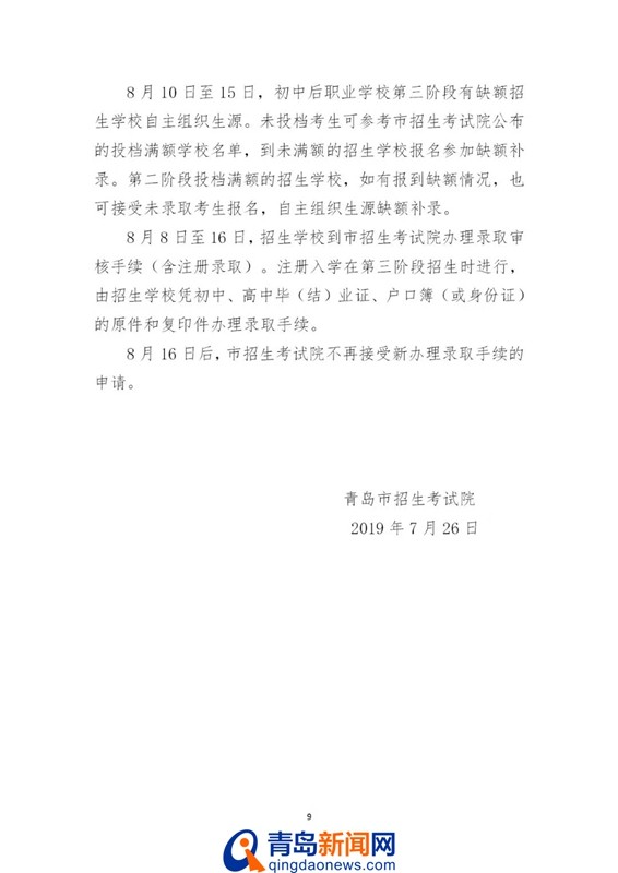 青岛中考第7次录取线公布 学前教育高职390分