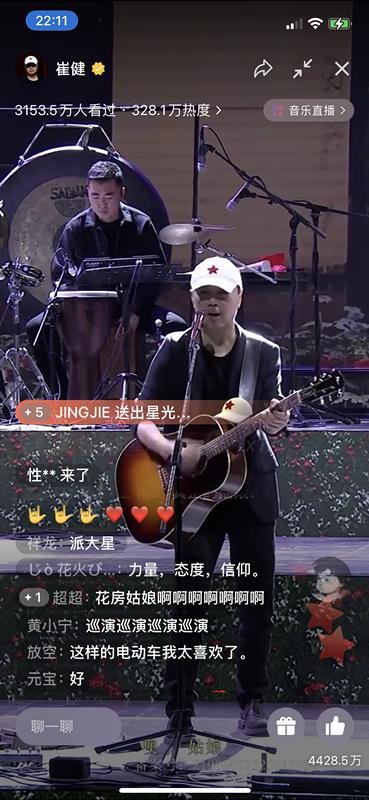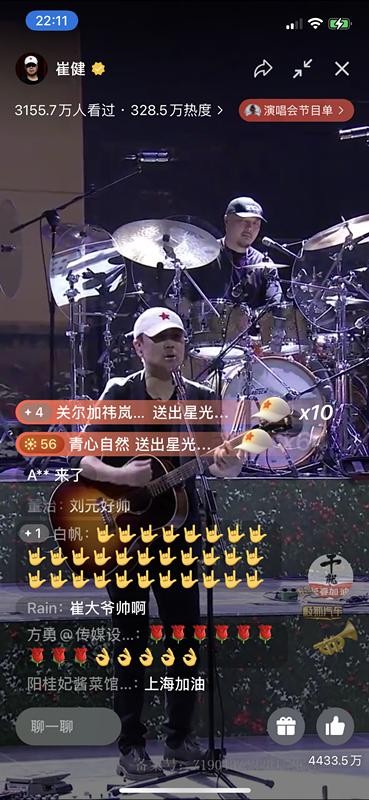 崔健“继续撒点野”首场视频号线上演唱会15日晚九点举行,演唱会接近尾声,崔健演唱了经典歌曲《花房姑娘》,同时鼓励观众多发弹幕。