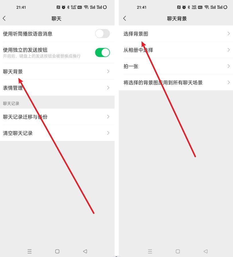 2、然后在聊天里点击【聊天背景】,接着根据自己的选择选择一个选项,小编以【选择背景图】为例;