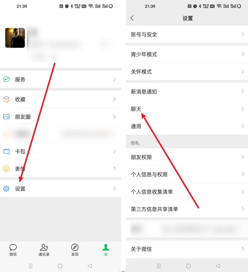 1、打开我们的微信app,然后在【我】的中点击【设置】,接着在设置里找到并点击【聊天】;