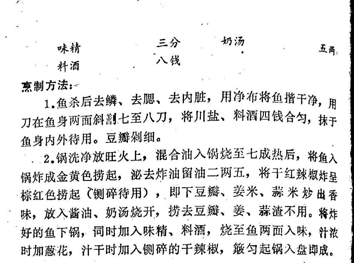调料:干红辣椒三钱;郫县豆瓣三钱;川盐一钱;酱油八钱;味精三分;料酒八线;奶汤五两。