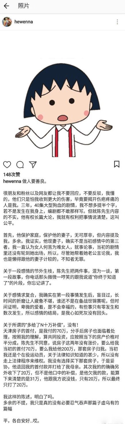 然而,事件已经闹得沸沸扬扬,并且牵扯到了金钱的问题。今天凌晨,何雯娜在社交平台发长文回应了陈一冰,证实陈一冰现在的妻子并非第三者,但当初确实有一段感情节外生枝,陈一冰还曾在电话中说“你终于知道了”,而关于感情求复合自己确实盲目过。