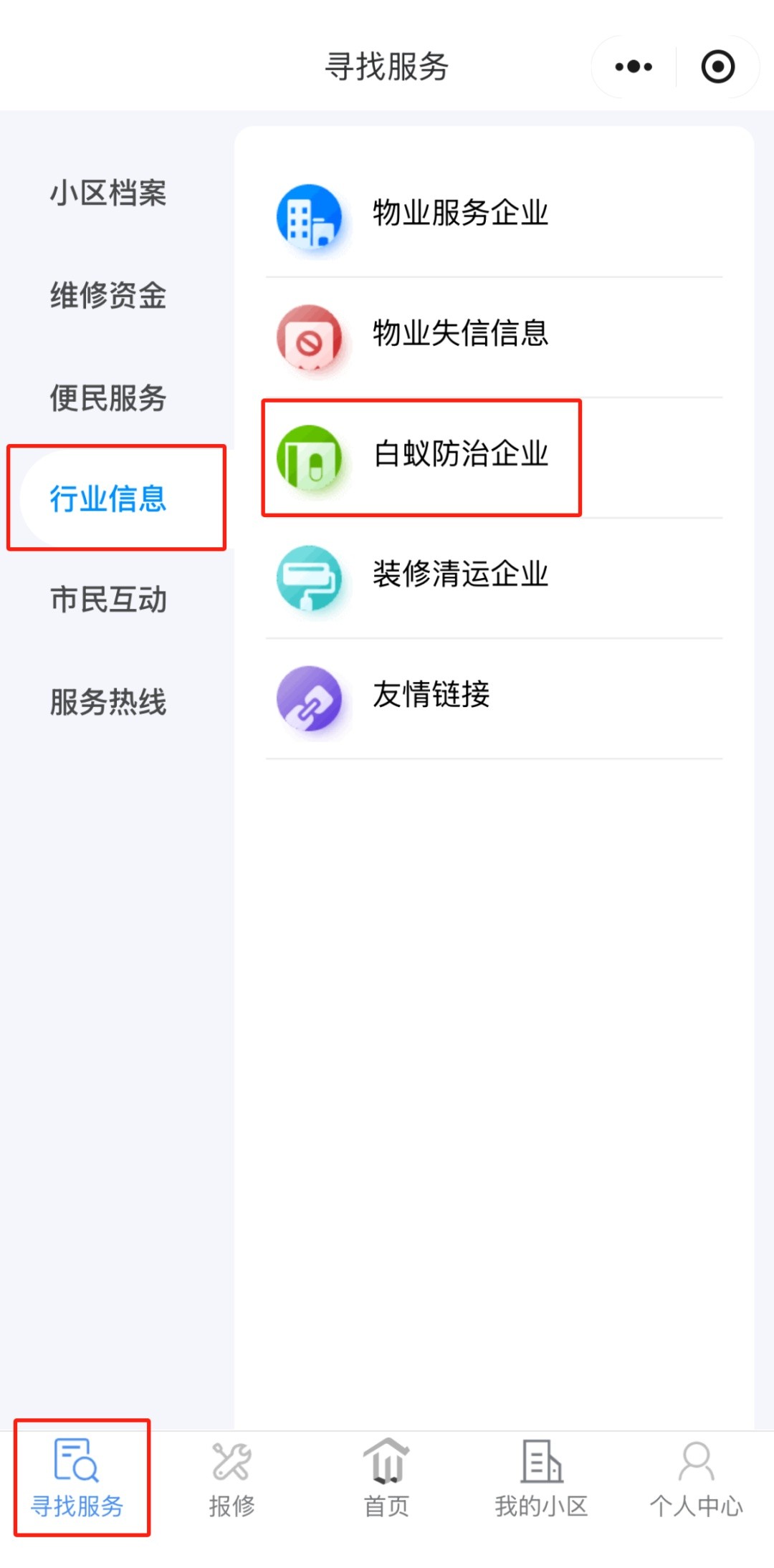 注册“上海物业”小程序,绑定小区后,可在“上海物业”小程序“寻找服务”菜单中的“白蚁防治企业”名录中查询白蚁防治企业的联系电话、收费标准等。