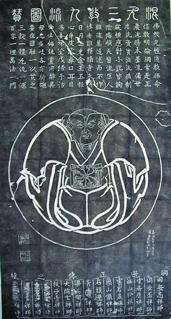少林寺还有一些关于三教合一的碑铭,《三教圣像》就是比较早的一个。碑铭刻于1209年七月,碑上线刻了三个人物,分别是佛教的释迦牟尼,儒家的孔子,道家的老子。画像由僧人祖昭所绘,画像上部还刻有唐肃宗李亨皇帝撰写的《三教圣像赞》文。碑铭以赞和图的形式来阐述三教合流的思想。