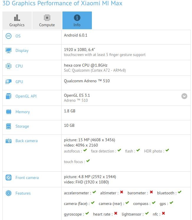 之前有网友猜测小米Max并非定位旗舰,但数据库给出的配置确是很惊人的,妥妥的是中高端旗舰机。来着GFXbench数据显示,小米Max搭载6.4英寸巨屏,分辨率为1920x1080,CPU为1.8GHz高通八核处理器(或为骁龙652),内置2GB RAM+16GB ROM,前置为500万+1600万主摄像头,预装基于Android 6.0.1的MIUI 7系统。
