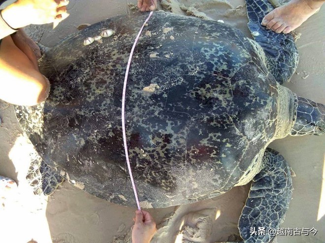通过检查,这个海龟体重超过100公斤,仍然健康,没有严重受伤的迹象。海龟的尺寸为1.4米x 0.8 米,越南有关部门已给这只海龟戴上辨别识别牌((C)00040),把它放归大自然环境。