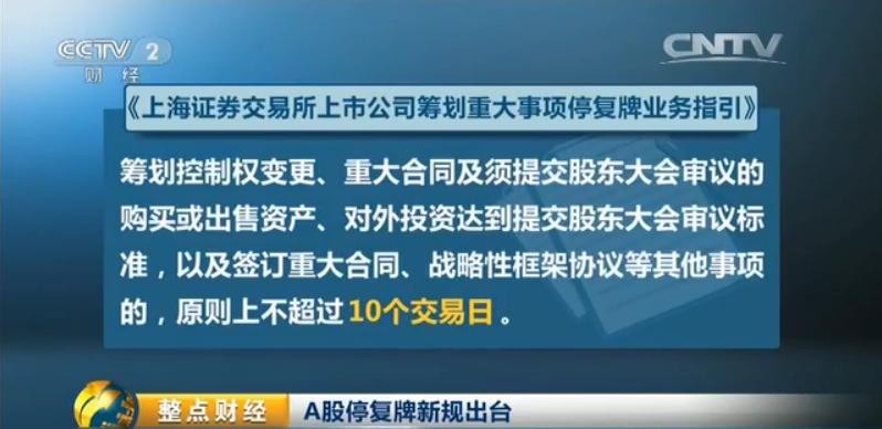 央视财经(《整点财经》)5月27日,上交所和深交所相继发布A股停复牌新规,对重大资产重组等停复牌作出新的规定。