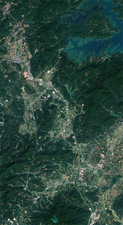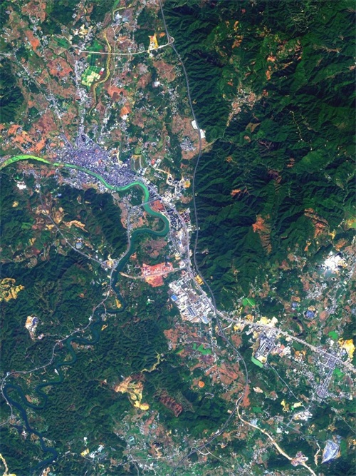 图七和图八:龙门县。建设中的惠龙高速清晰可见。从卫星图上看县城,这些年来的建成区依然没什么变化,加油!