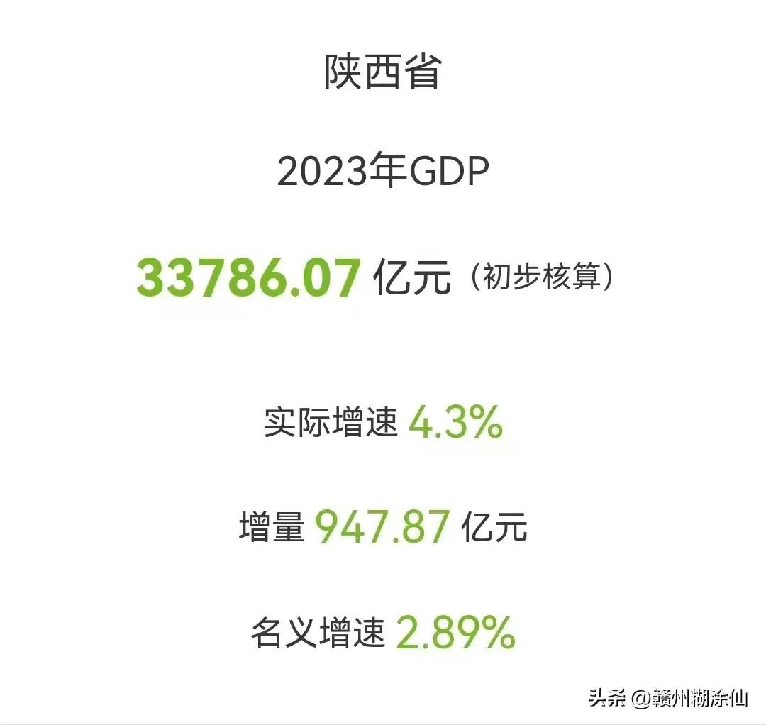 2023年,陕西省实现地区生产总值33786.07亿元,按不变价格计算,同比增长4.3%。分产业看,第一产业增加值2649.75亿元,同比增长4.0%;第二产业增加值16068.90亿元,增长4.5%;第三产业增加值15067.42亿元,增长4.1%。