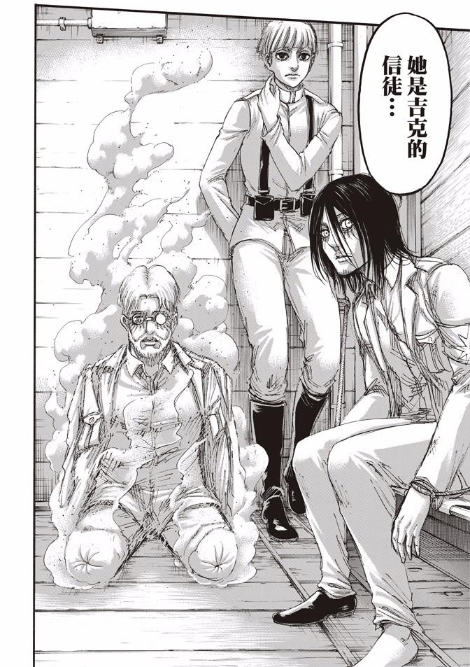 吉克带来了岛上的人所需的很多东西,众人也得知吉克为何在七岁的时候就举报了父母,让父母以及背后的艾尔迪亚复权派失去一切的原因。
