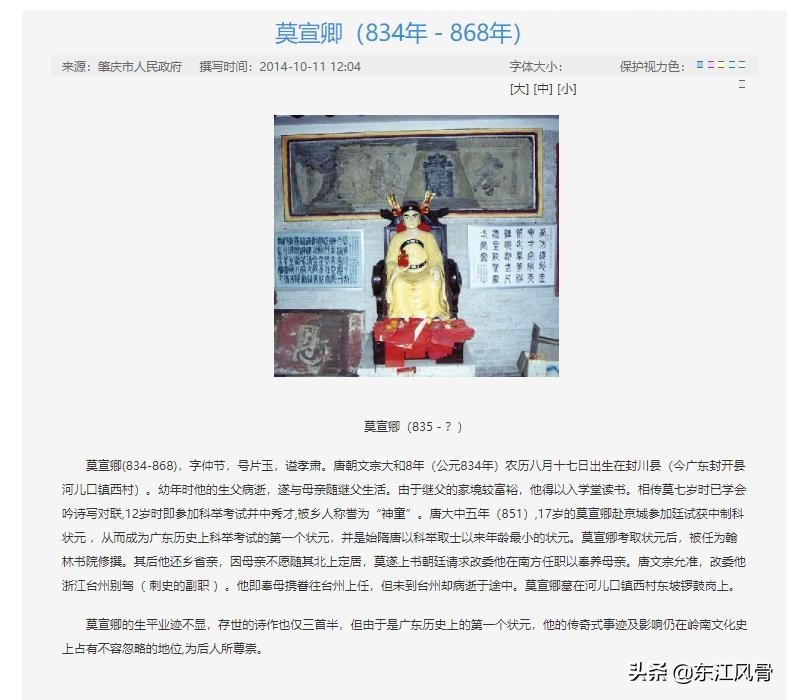 肇庆政府网上对莫宣卿的介绍,宣称莫宣卿是“广东历史上科举考试的第一个状元”