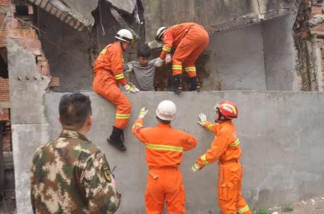 考虑到男孩腿部受伤,消防员立即佩戴好防护装备爬到围墙内,将男孩放到自己背上,准备将他背出来,墙内男孩表示,自己状况还好,不需要背。一旁的两名消防员便将男孩从阻挡的围墙内拉了出来。男孩被救出后仍面露惊惧之色,口中喃喃的说:“上厕所上的好好的,突然房顶就塌了。”