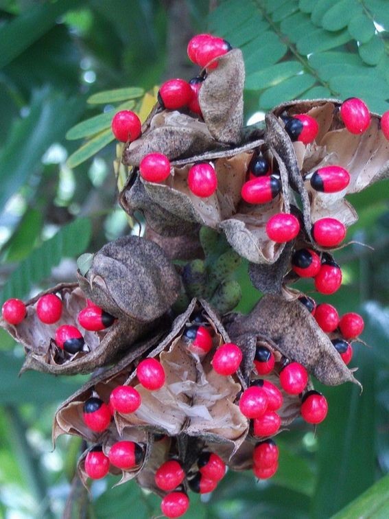 荚果长圆形,果瓣革质,成熟时开裂,里面有种子2-6粒,种子椭圆形,表面光滑有光泽,上部三分之二鲜红色,下部黑色,9-10月果实成熟。