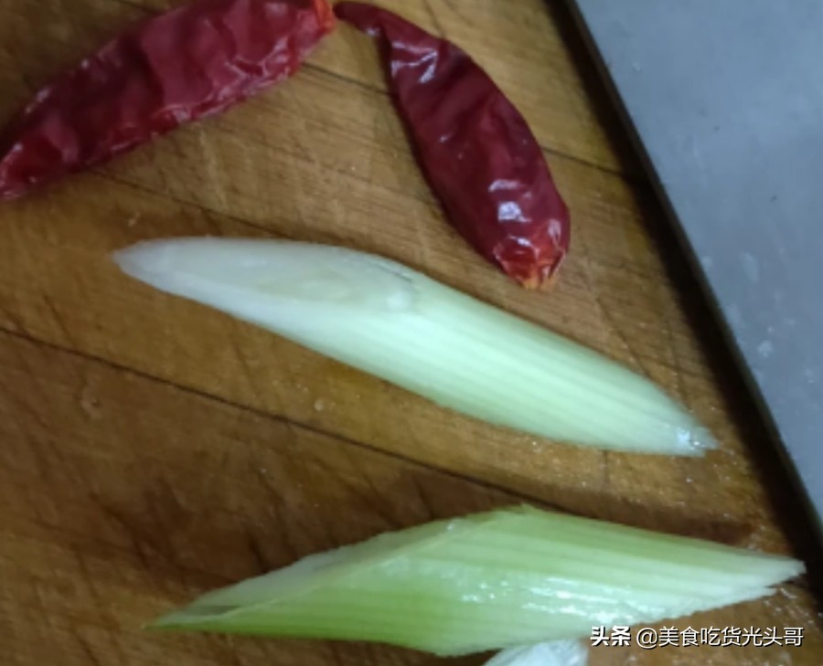 再准备大葱切成斜刀段,能更好的发挥他的作用,干辣椒几颗,如果你不喜欢吃辣,可以不放,辣椒只是以个人爱好而已。