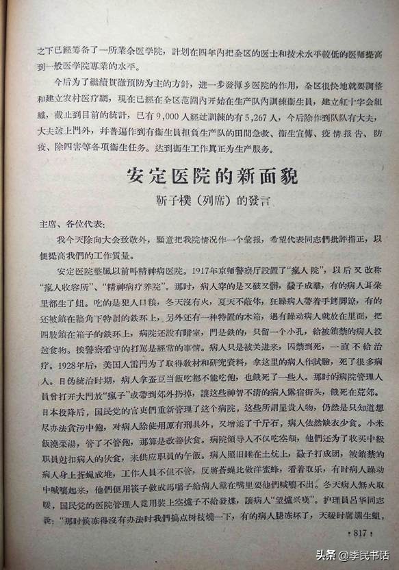 图2是我查得的,1958年北京市召开第三届人代会议,出版了《北京市第三届人民代表大会第一次会议汇刊》,就载有一篇“安定医院的新面貌 靳子朴列席代表发言”,说它的前身是1917年京师警察厅设置的“疯人院”,后来改称“疯人收容所”、“精神病疗养院”……