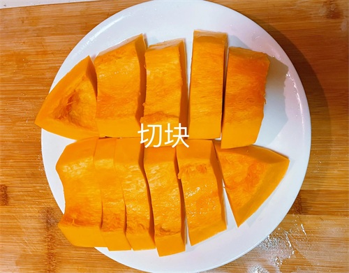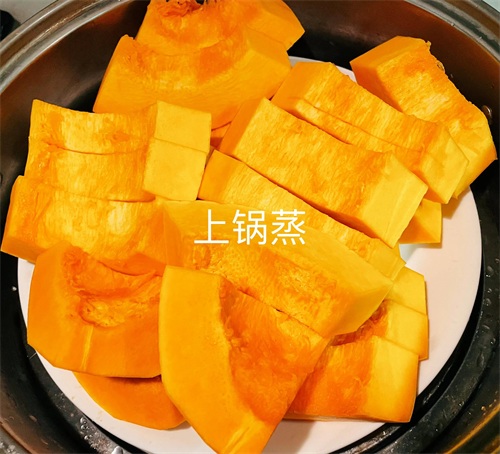 1、南瓜清洗干净,削皮,切块,上锅蒸40min,大家可以根据南瓜蒸的具体情况来看需要蒸多久;