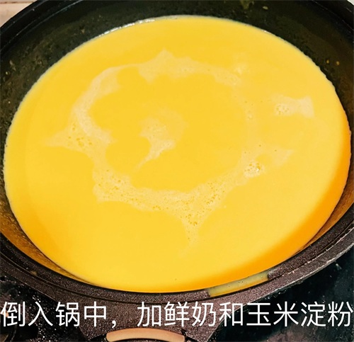 3、将搅打细腻的南瓜倒入锅中,加入鲜奶和玉米淀粉,其中玉米淀粉需要先加水搅拌化开,再加入锅中;