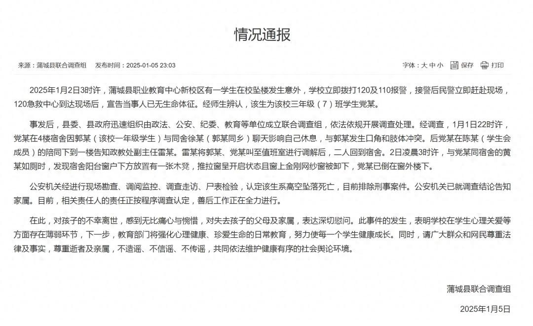 1月5日深夜,蒲城县联合调查组就“一学生在校坠楼发生意外”发布情况通报,通报全文如下: