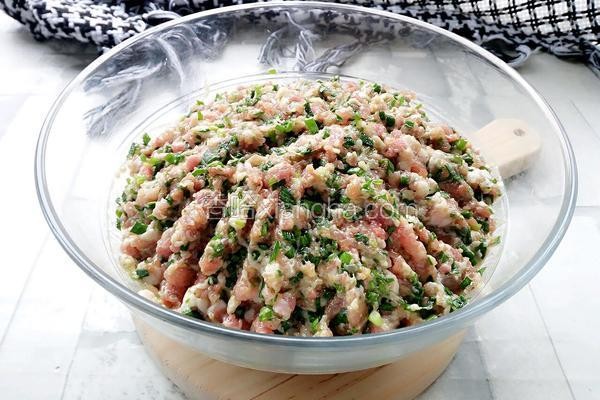 茄盒子的制作:把洗净的韭菜切碎,把猪肉切成末,和韭菜放在一起,放上葱末姜末,倒上适量食用油和酱油,加入食盐,搅拌均匀。