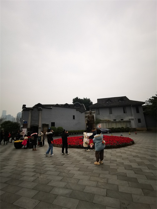 站在拥有百年历史的曾家岩50号的三层公馆楼前,石灰色的墙体、黑色的瓦房顶、深棕色的阁楼窗户仿佛在静静的述说着这里百年前发生的历史事件。风度翩翩的周公铜像就树立在公馆前面的广场中央,他右手拿着风衣,眼神从容自信,朝着正前方走去。