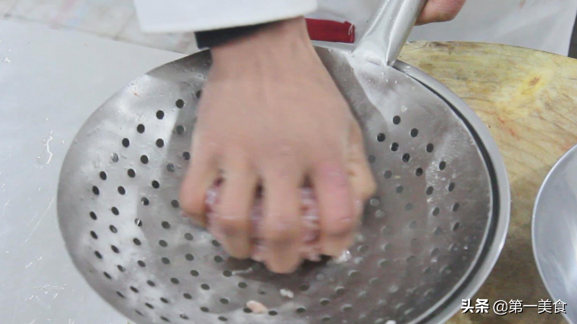把肉丝用清水清洗干净之后,放在漏勺里挤去水分。