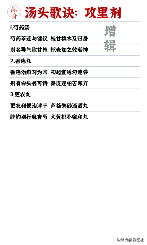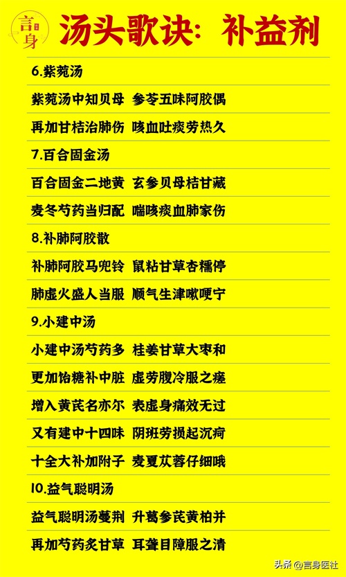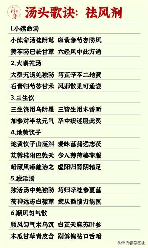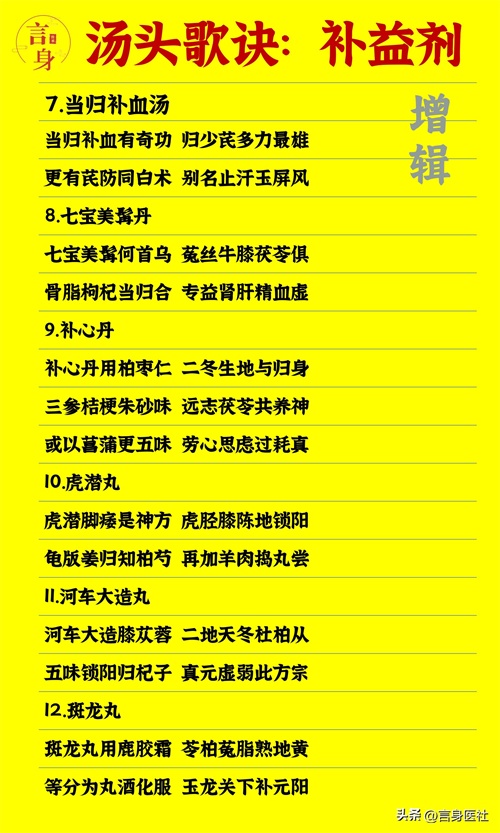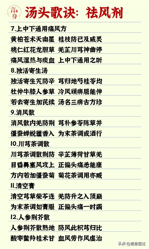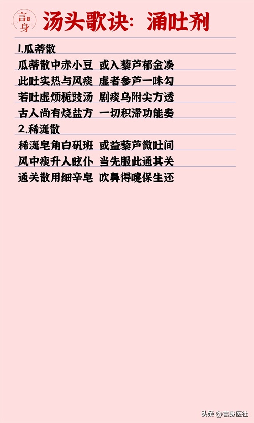 《汤头歌》 ,清代汪昂撰,刊于1694年。书中选录中医常用方剂,分为补益、发表、攻里、涌吐等20类。以七言歌诀的形式加以归纳和概括。并于每方附有简要注释,便于初学习诵,是一部流传较广的方剂学著作。
