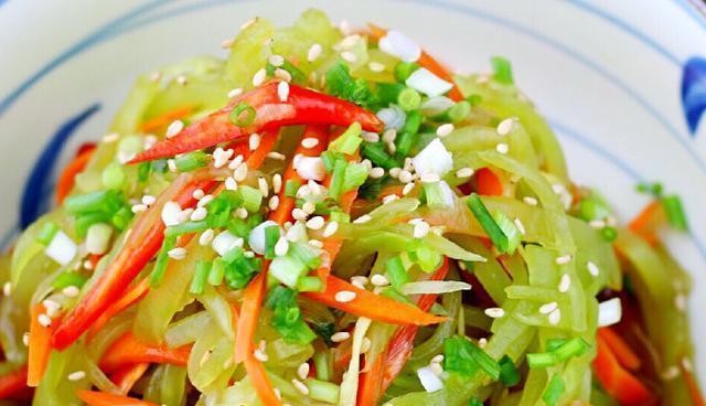 将一半沙拉切成片,与糖、盐和醋混合均匀。您还可以添加芝麻油。成品菜香脆可口。