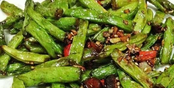 扁豆去筋,洗净,在沸水中磨碎,晾干,切成细条。将它们与味精和盐混合,然后与准备好的芝麻酱、蒜瓣和醋混合。
