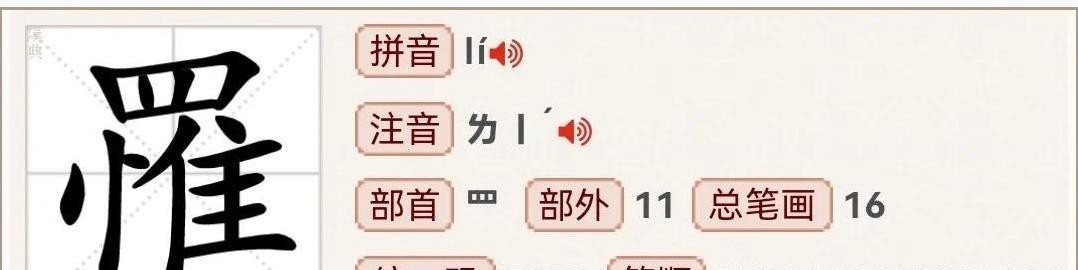 回到读音上,尽管罹字的确没有明确的读音标注,但从字形上来看,它的偏旁结构和音频可以让我们推断出正确的读音。罹字由“网”和“立”两个部分组成,而“网”部的读音为“lí”,“立”部的读音为“lì”。因此,可以推断出罹字的正确读音是“lí”。