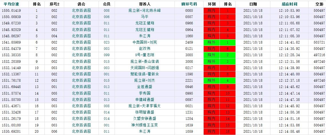 中奥国际+刘宪的2409赛鸽,12点14分41秒报到,获得院外冠军、总排名第六名,分速为1541.8598米/分。9号+董志刚 、庞立新+泰山信鸽 的赛鸽分别获得院外亚军、季军。