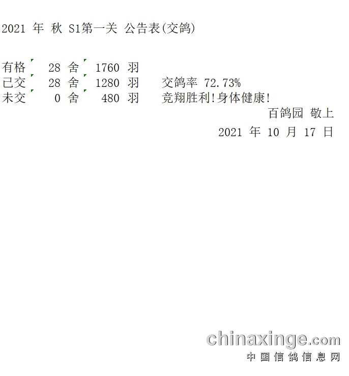 本场比赛10月17日下午1点至4点集鸽,集鸽全程由中国信鸽协会国家级裁判王鑫、李国康及北京市信鸽协会委派裁判组进行集鸽工作,参赛鸽友均在非集鸽区域等待,第一关共集鸽28舍、1280羽赛鸽。
