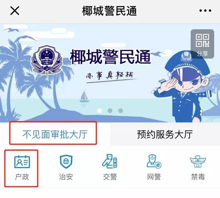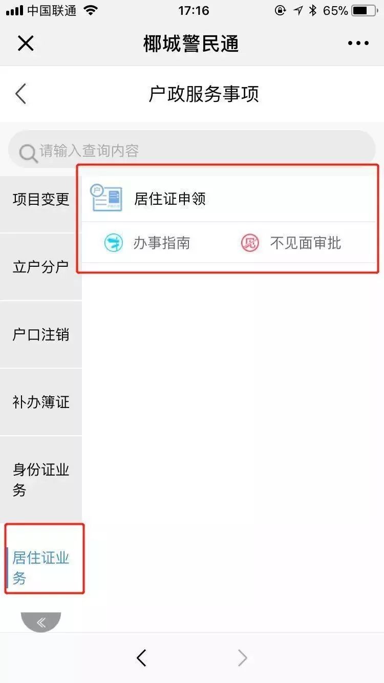 3.选择【户政】项目内的【居住证业务】点击“居住证申领”,选择“不见面审批”,如实填写个人信息。