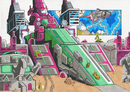 铁甲龙是霸天虎的成员,也是大型的基地金刚,可以变形成巨型恐龙。插画中的它看起来要比猛大帅色彩鲜艳很多。