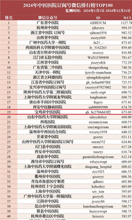 全国第19名!宝鸡市中医医院位列2024全国中医医院微信百强名单前茅