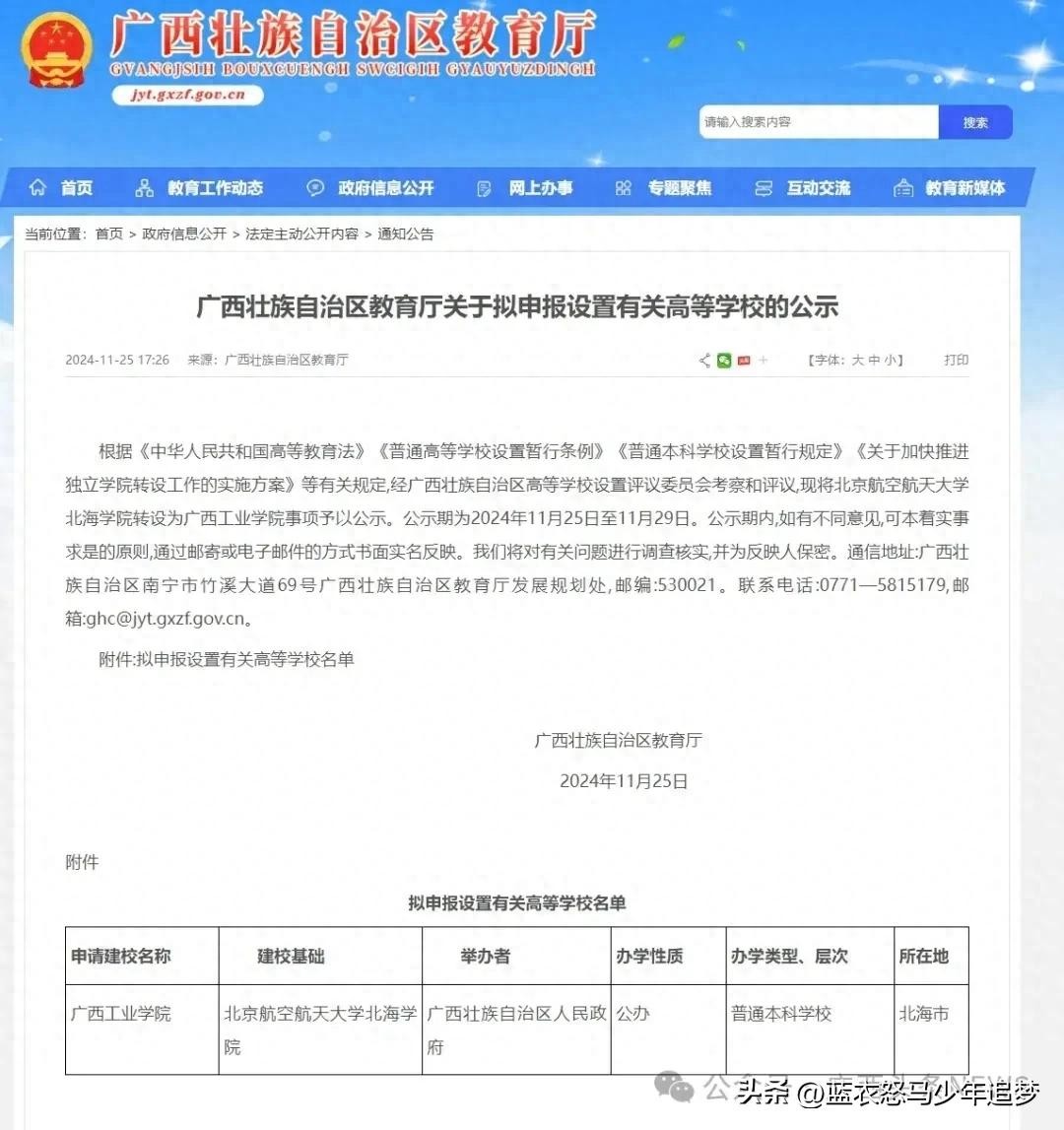 11月25日,广西教育厅发出的一则公示显示,已停止招生11年的民办独立学院—北京航空航天大学北海学院,拟转设为公办的广西工业学院!