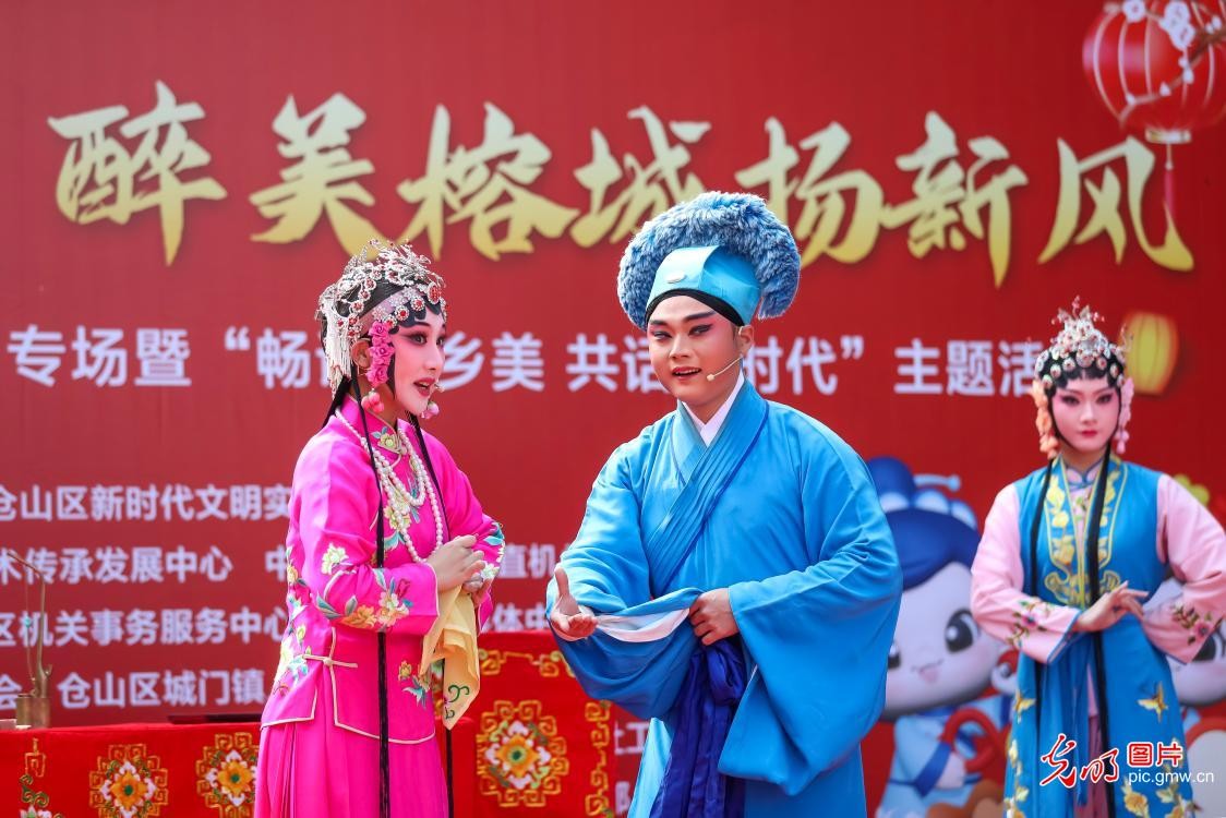 2025年2月24日,福建福州仓山区城门镇,闽剧文化志愿者与老人共庆传统“拗九节”,介绍并制作“拗九粥”。每年农历正月二十九为福州特有的“拗九节”,人们用多种食材煮甜粥祭祖、馈赠亲友和孝敬父母。如今,这个传统节日已成为福州的敬老节,是福建省第七批省级非物质文化遗产代表性项目。图为福州市仓山区城门镇,闽剧文化志愿者正在现场给老人表演节目。(谢贵明摄/光明图片)