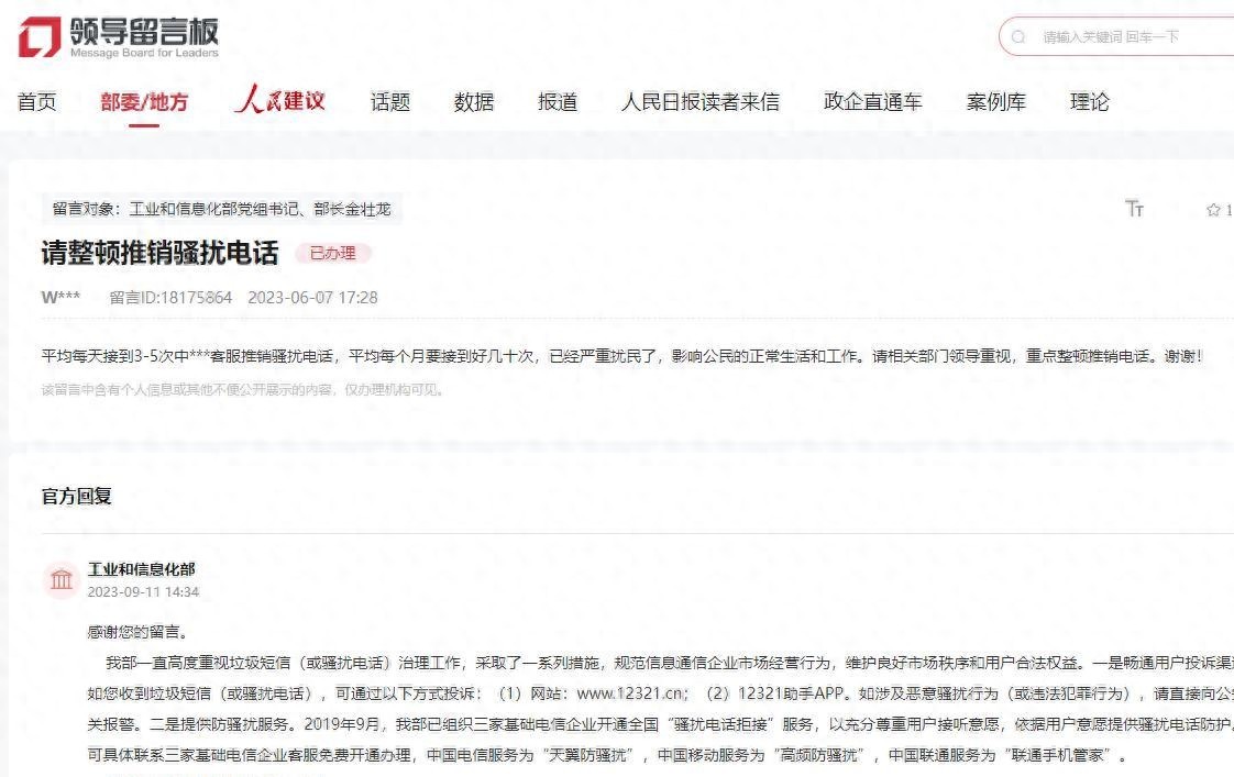 人民网北京9月26日电(记者申佳平)近日,一位网友在人民网“领导留言板”上留言抱怨每天接到3-5次推销骚扰电话,严重干扰了公民的正常生活和工作。此事引起了广泛关注,并得到了工信部的回复。