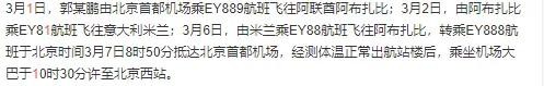 由米兰乘坐航班飞往阿布扎比,又转乘航班抵达北京。