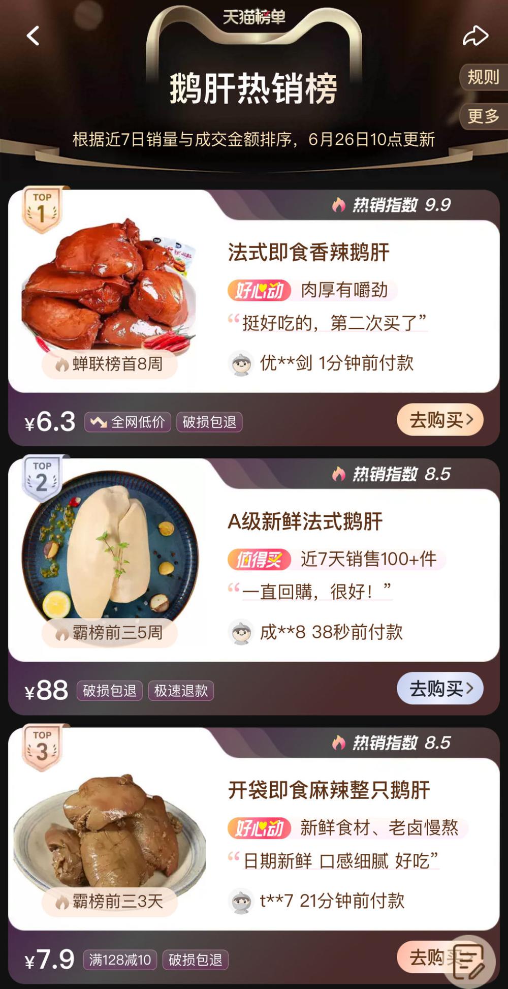 网上渠道也起来了。自从年初两地的鹅肝隐藏特产被 " 开盒 " 后,网店迎来了一波销量增长,临朐的从业人员称日营业额估计在一两万元。我去看了看天猫的鹅肝热销榜,依然有源源不断的买家光顾。