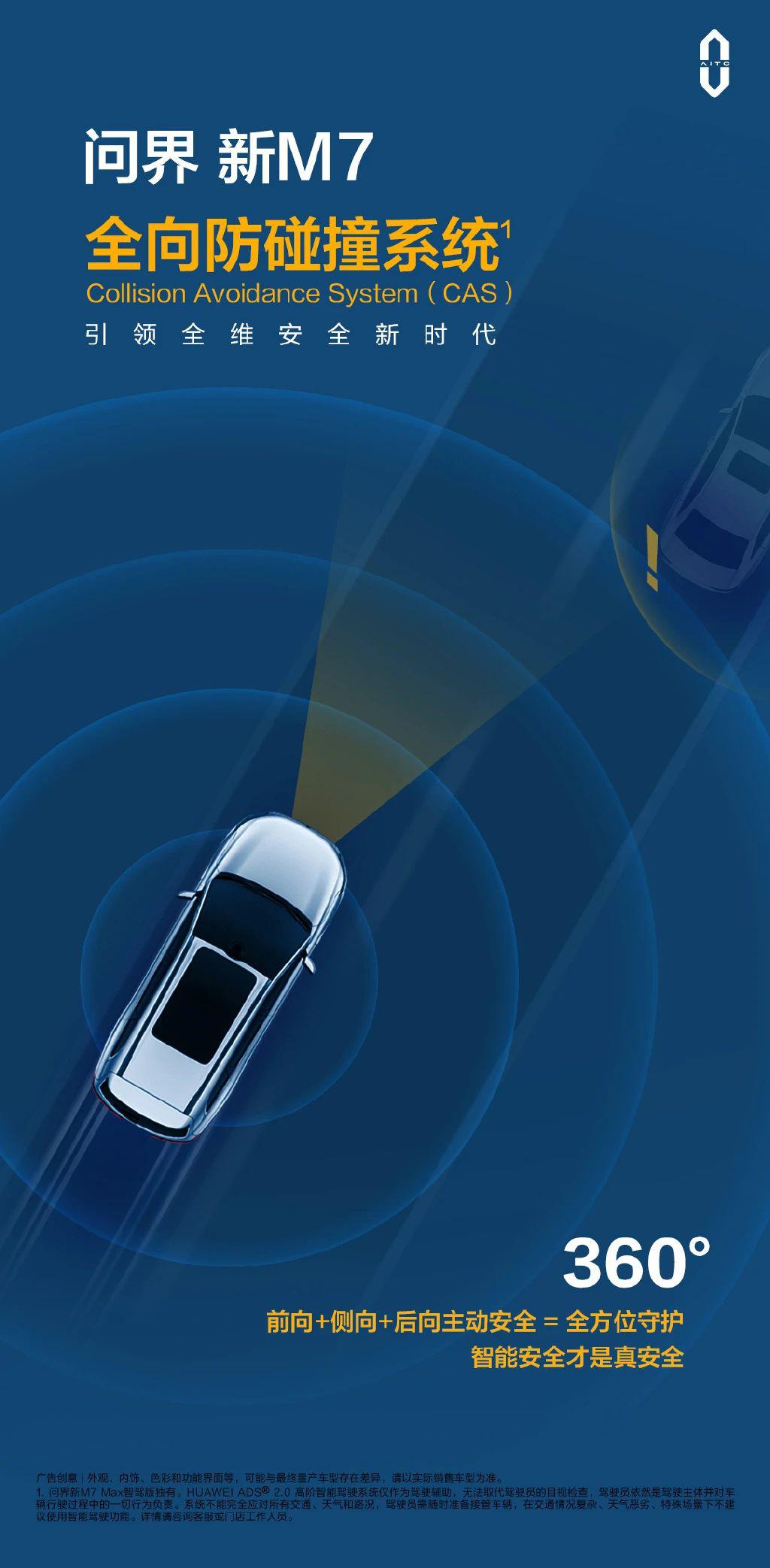 但是问界新 M7 已经全球首发了全向防碰撞系统,加入了侧向、后方的 AEB 能力,并且将最高刹停速度提升至 90 km/h。